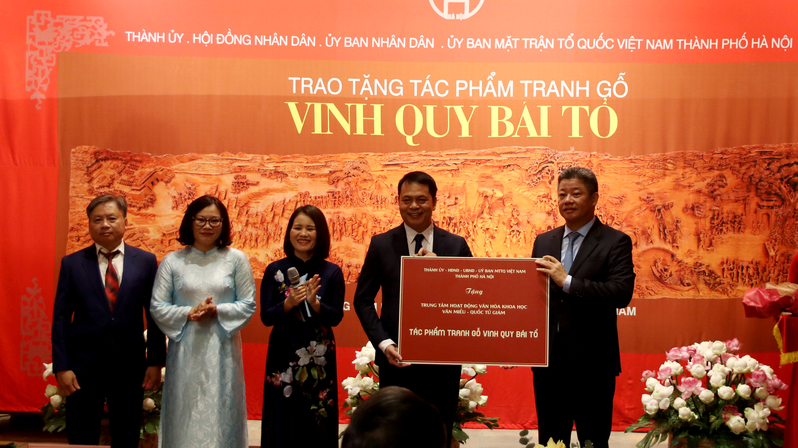 On the morning of October 10, at the Thái Học House of the Special National Relic Văn Miếu – Quốc Tử Giám, the Hanoi Party Committee, People’s Council, People’s Committee, and Vietnam Fatherland Front Committee of Hanoi held a ceremony to present the wooden artwork “Vinh quy bái tổ” to the Centre for Cultural and Scientific Activities Văn Miếu – Quốc Tử Giám..