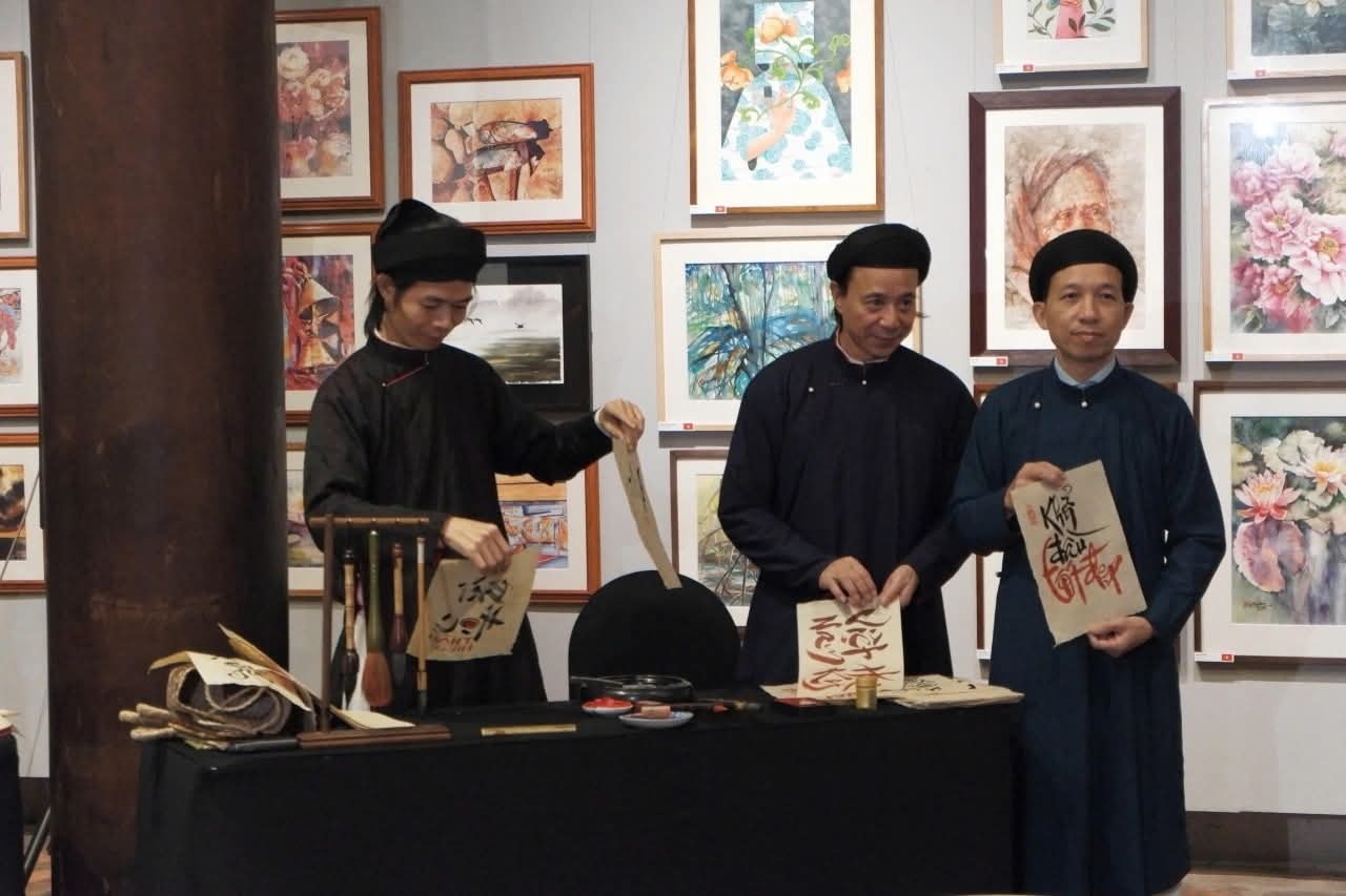 Hoạt động thầy đồ viết thư pháp Hán nôm và Chữ quốc ngữ - món quà tặng đại biểu và khán giả tại tọa đàm.