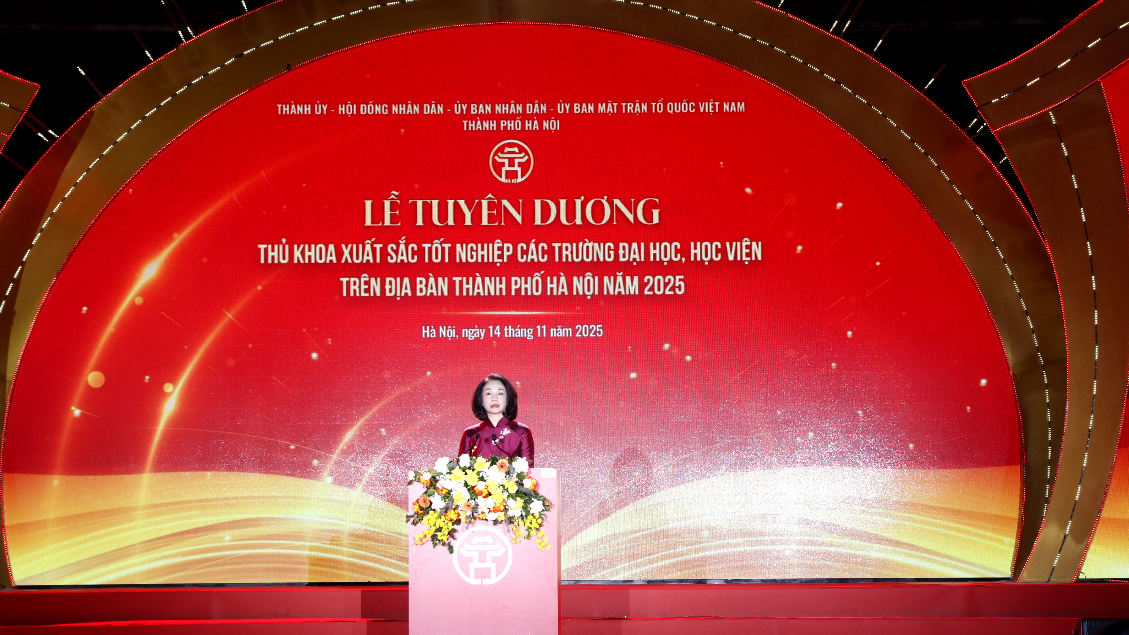 Đồng chí Vũ Thu Hà, Phó Chủ tịch Ủy ban nhân dân Thành phố Hà Nội phát biểu tại lễ tuyên dương thủ khoa 2025