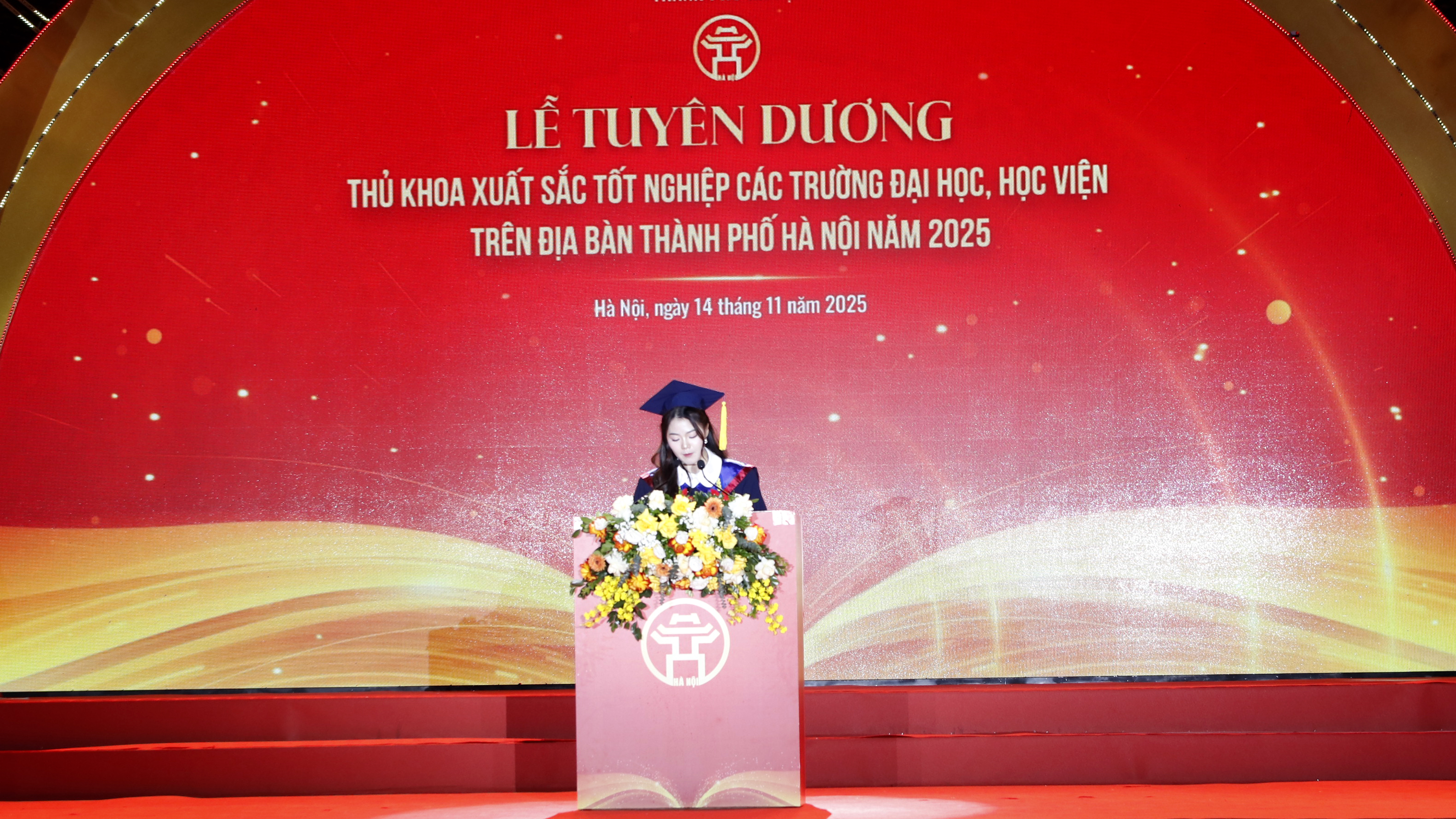 Thay mặt các thủ khoa xuất sắc, bạn Nguyễn Thúy Hường, trường Đại học Công nghệ, Đại học Quốc gia Hà Nội đã bày tỏ lòng biết ơn sâu sắc đến các đồng chí lãnh đạo Đảng và Nhà nước, và cho biết: Mỗi bước tiến của Hà Nội hôm nay là niềm tự hào, là động lực để thế hệ trẻ chúng em tiếp tục khẳng định bản lĩnh, trí tuệ, tinh thần tiên phong góp phần xây dựng Thủ đô văn minh, hiện đại và hạnh phúc, xứng đáng với tầm vóc và khát vọng của đất nước Việt Nam trong thời kỳ mới. Với tất cả nhiệt huyết, trí tuệ, khát vọng cống hiến của tuổi trẻ hôm nay, chúng em nguyện tiếp nối truyền thống anh hùng văn hiến của Thủ đô Hà Nội, kế thừa tinh thần tiên phong, dấn thân, sáng tạo của các thế hệ thanh  niên đi trước…không ngừng học tập, rèn luyện, phát huy tinh thần sáng tạo, góp phần xây dựng một Thủ đô xanh, văn minh, đáng sống, nơi hội tụ tri thức, nhân văn, khát vọng phát triển.”